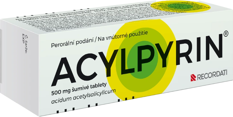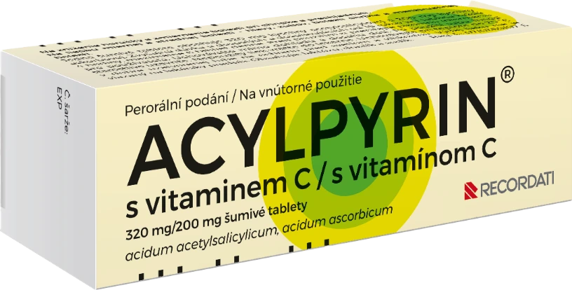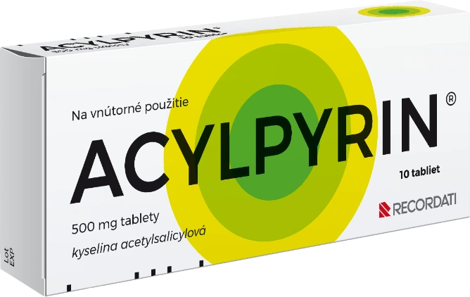 ACYLPYRIN® 500 mg tablety; ACYLPYRIN® 500 mg šumivé tablety. Jedna tableta obsahuje 500 mg kyseliny acetylsalicylovej. ACYLPYRIN® s vitamínom C 320 mg/200 mg šumivé tablety. Voľnopredajné lieky na vnútorné použitie. Pozorne si prečítajte celú písomnú informáciu pre používateľa predtým, ako začnete užívať tento liek a poraďte sa so svojím lekárom alebo lekárnikom. Liek je určený pre dospelých a mladistvých od 16 rokov. Liek sa nesmie užívať v posledných troch mesiacoch tehotenstva. Môže sa ojedinele užiť počas dojčenia, pri pravidelnom užívaní vyšších dávok sa však musí dojčenie prerušiť.